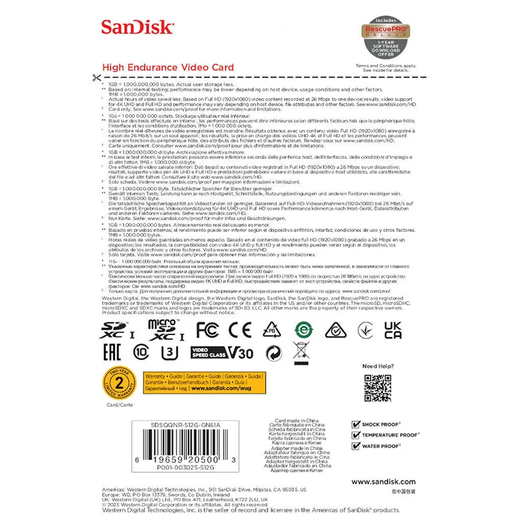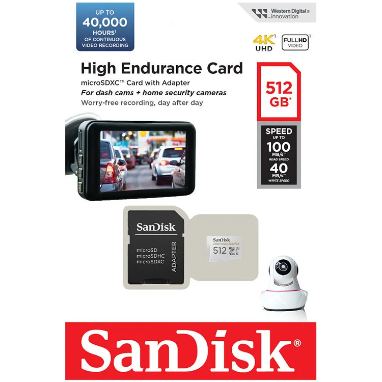 Karta microSD SanDisk High Endurance została zaprojektowana z myślą o wysokiej trwałości, dzięki czemu doskonale sprawdzi się w kamerach samochodowych lub domowych systemach monitorowania. Bez obaw można używać jej w ekstremalnych warunkach, a dzięki pojemności 512GB będzie można zapisać wiele godzin materiału wideo.